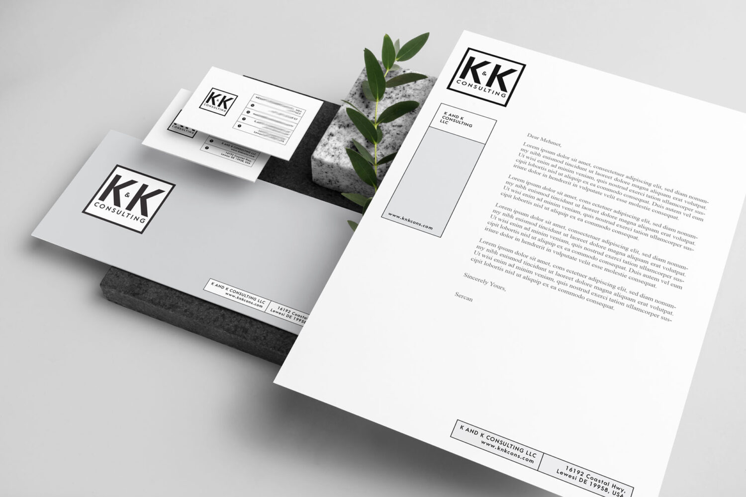 Amerika merkezli Türk firması K&K Consulting için logo, kartvizit, antetli kağıt, cepli dosya ve zarf tasarımları.